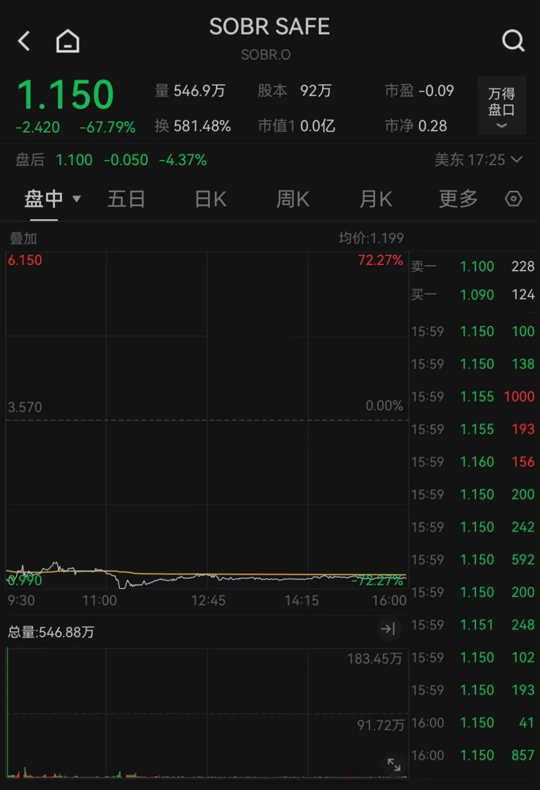 科技仪器制造商SOBR SAFE全日走势震憾,盘中最低跌超72%,屡次触发熔断。